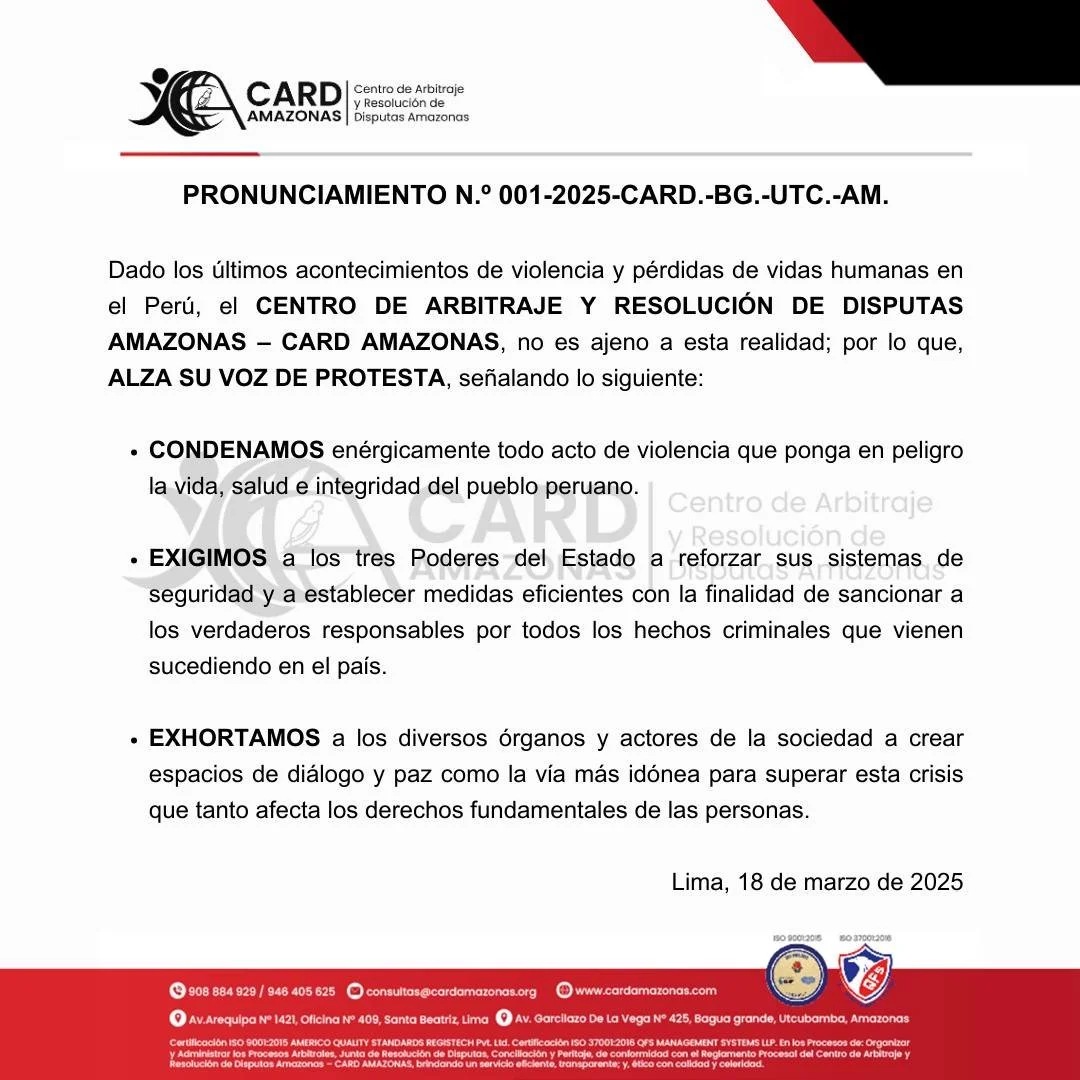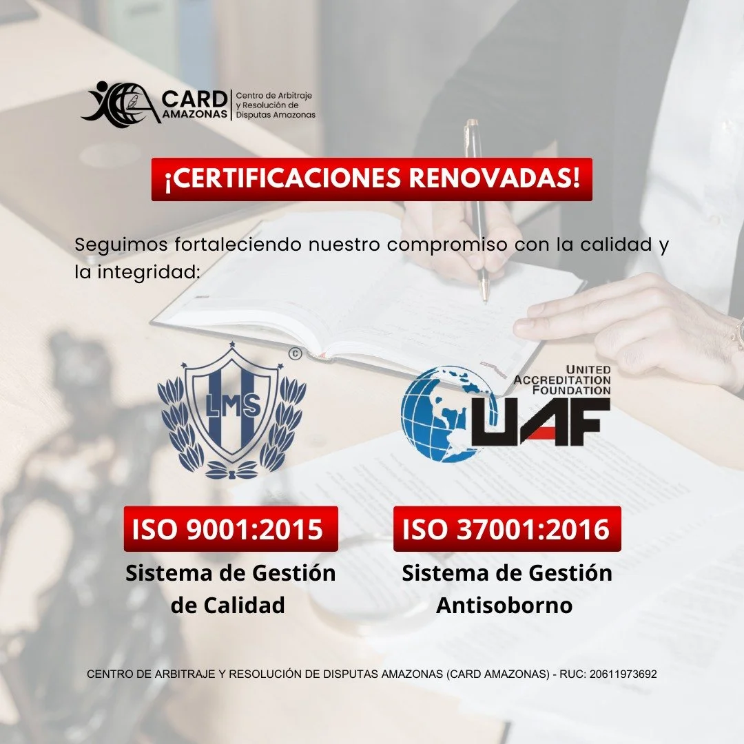 CARD Amazonas integra el grupo de las 37 Instituciones Arbitrales y Centros de Administración de Juntas de Prevención y Resolución de Disputas, reafirmando nuestro compromiso con la transparencia, la eficiencia y la excelencia profesional.